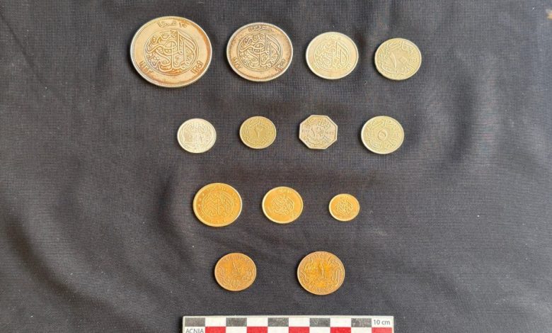 كما عثر بداخلها على ثلاث عشرة قطعة نقدية من فئات مختلفة، تراوحت ما بين المليمات والعملات الذهبية من فئة 100 قرش.