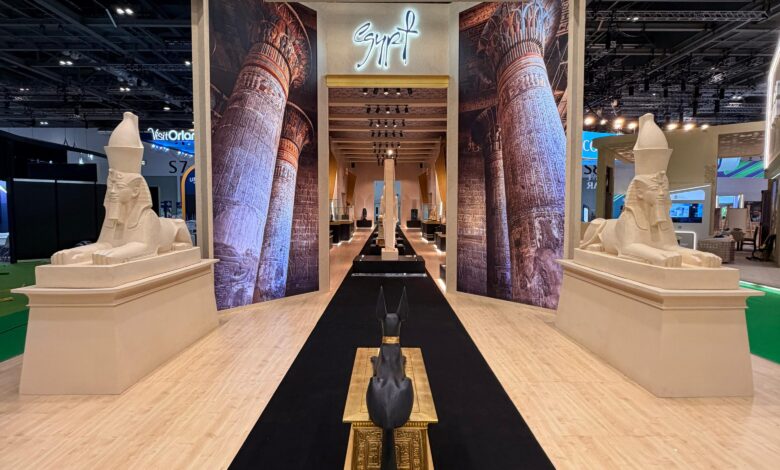 وينقسم الجناح إلى مساحتين رئيسيتين؛ الجزء الأول يمتد على مساحة 400 متر مربع ويضم نموذجًا مصغرًا لإحدى قاعات الملك توت عنخ آمون بالمتحف المصري الكبير احتفالاً بافتتاح المتحف، ليضم 54 مستنسخ أثري لمقتنيات الملك الذهبي أيقونة المتحف وفي نهايته شاشات على شكل هرمي لعرض الأفلام الترويجية عن المقصد السياحي المصري وما يتمتع به من منتجات سياحية متنوعة ومختلفة.