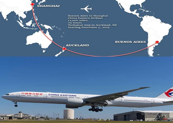 انطلقت الرحلة الضخمة يوم الخميس من شنغهاي، وانتهت في بوينس آيرس، مع توقف لمدة ساعتين في أوكلاند بنيوزيلندا للتزود بالوقود وتناوب الطاقم.
