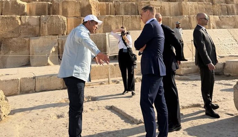 وعقب انتهاء الزيارة بالمتحف، توجه رئيس جمهورية فنلندا والوفد المرافق له إلى منطقة أهرامات الجيزة، حيث كان في استقبالهم أشرف محيي الدين، مدير عام آثار القاهرة والجيزة، والذي اصطحبهم في جولة تفقدية داخل المنطقة الأثرية، استعرض خلالها تاريخها وأبرز الاكتشافات الأثرية بها، إلى جانب أعمال الحفائر الجارية حاليًا.